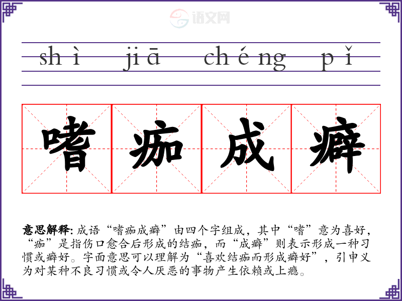 成语“嗜痂成癖”由四个字组成,其中“嗜”意为喜好,“痂”是指伤口愈合后形成的结痂,而“成癖”则表示形成一种习惯或癖好。字面意思可以理解为“喜欢结痂而形成癖好”,引申义为对某种不良习惯或令人厌恶的事物产生依赖或上瘾。