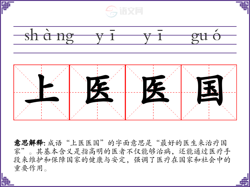 成语“上医医国”的字面意思是“最好的医生来治疗国家”。其基本含义是指高明的医者不仅能够治病,还能通过医疗手段来维护和保障国家的健康与安定,强调了医疗在国家和社会中的重要作用。