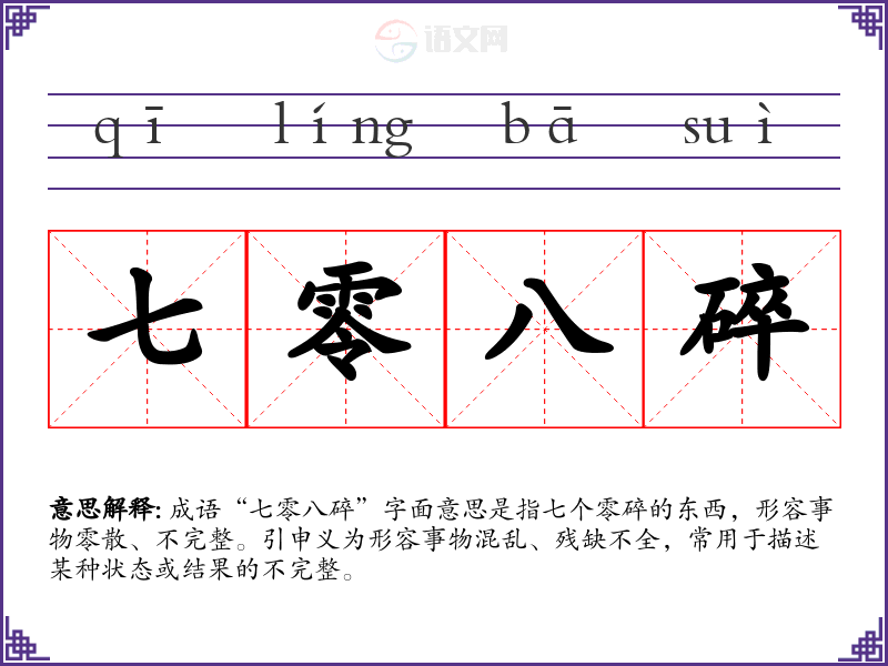 成语“七零八碎”字面意思是指七个零碎的东西,形容事物零散、不完整。引申义为形容事物混乱、残缺不全,常用于描述某种状态或结果的不完整。