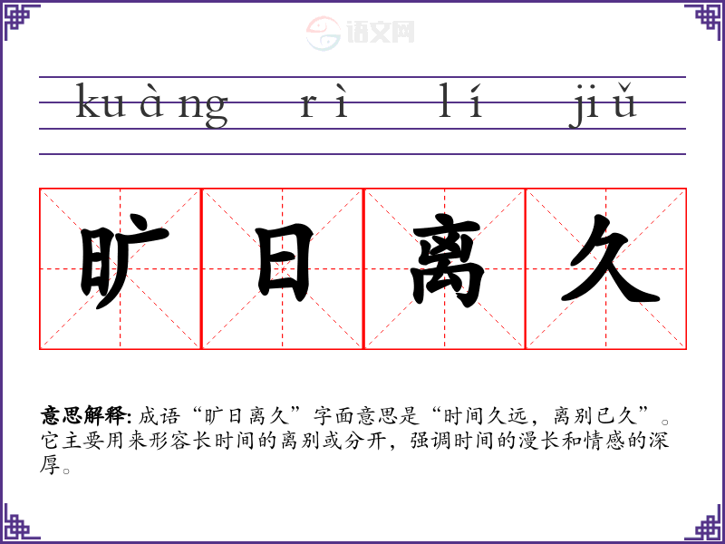 成语“旷日离久”字面意思是“时间久远,离别已久”。它主要用来形容长时间的离别或分开,强调时间的漫长和情感的深厚。