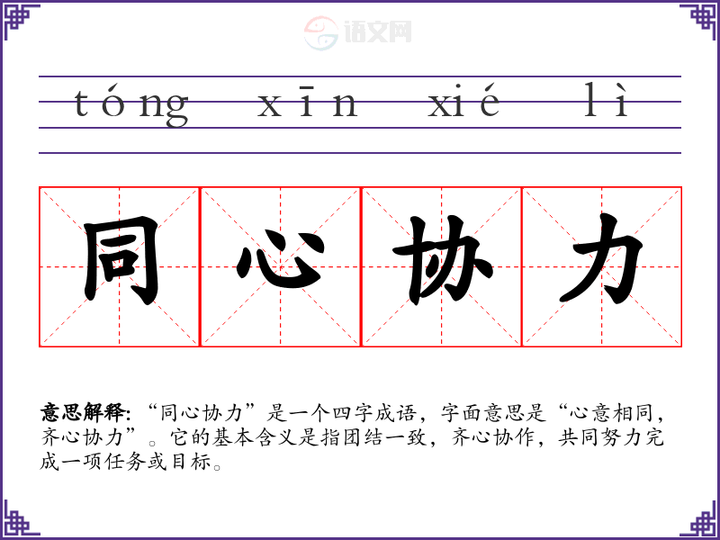 “同心协力”是一个四字成语,字面意思是“心意相同,齐心协力”。它的基本含义是指团结一致,齐心协作,共同努力完成一项任务或目标。