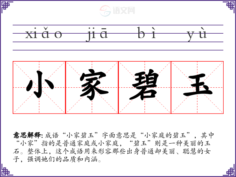成语“小家碧玉”字面意思是“小家庭的碧玉”,其中“小家”指的是普通家庭或小家庭,“碧玉”则是一种美丽的玉石。整体上,这个成语用来形容那些出身普通却美丽、聪慧的女子,强调她们的品质和内涵。