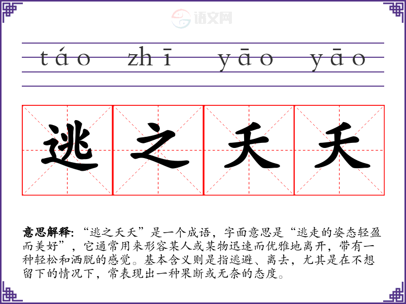 “逃之夭夭”是一个成语,字面意思是“逃走的姿态轻盈而美好”,它通常用来形容某人或某物迅速而优雅地离开,带有一种轻松和洒脱的感觉。基本含义则是指逃避、离去,尤其是在不想留下的情况下,常表现出一种果断或无奈的态度。