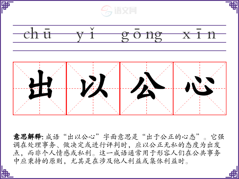 成语“出以公心”字面意思是“出于公正的心态”。它强调在处理事务、做决定或进行评判时,应以公正无私的态度为出发点,而非个人情感或私利。这一成语通常用于形容人们在公共事务中应秉持的原则,尤其是在涉及他人利益或集体利益时。