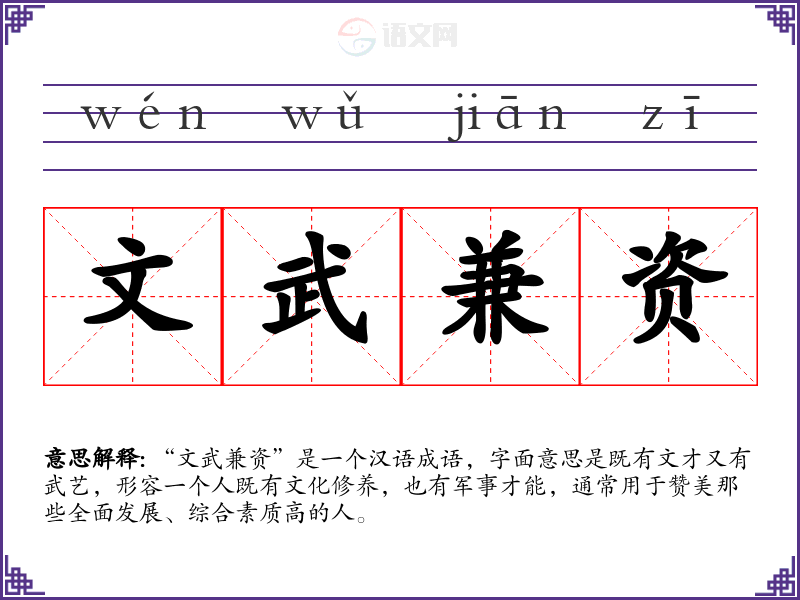 “文武兼资”是一个汉语成语,字面意思是既有文才又有武艺,形容一个人既有文化修养,也有军事才能,通常用于赞美那些全面发展、综合素质高的人。