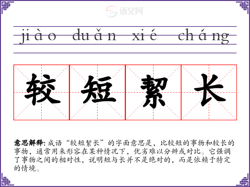 成语“较短絜长”的字面意思是,比较短的事物和较长的事物,通常用来形容在某种情况下,优劣难以分辨或对比。它强调了事物之间的相对性,说明短与长并不是绝对的,而是依赖于特定的情境。