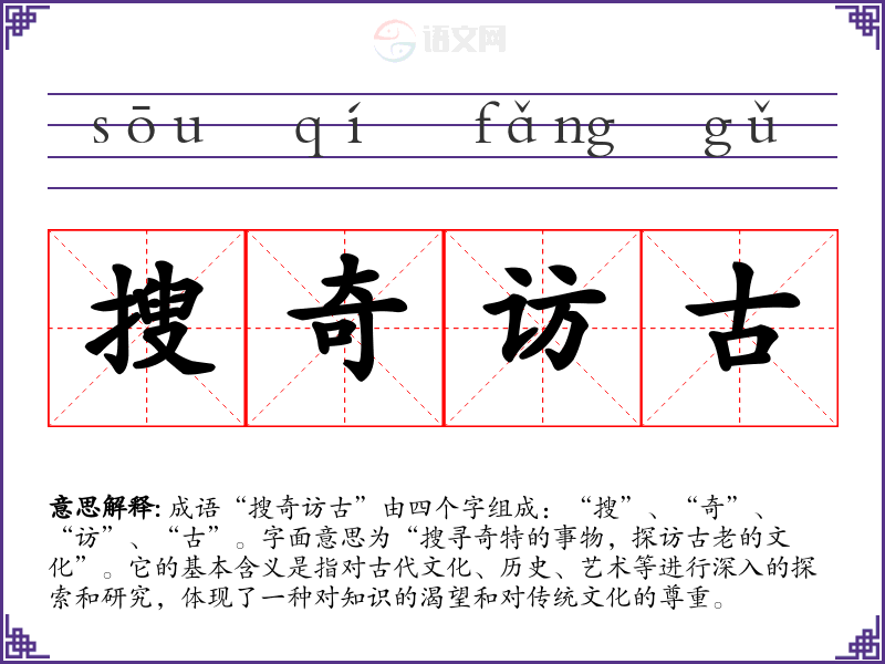成语“搜奇访古”由四个字组成:“搜”、“奇”、“访”、“古”。字面意思为“搜寻奇特的事物,探访古老的文化”。它的基本含义是指对古代文化、历史、艺术等进行深入的探索和研究,体现了一种对知识的渴望和对传统文化的尊重。