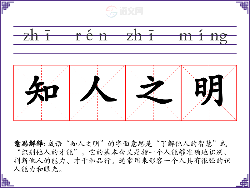 成语“知人之明”的字面意思是“了解他人的智慧”或“识别他人的才能”。它的基本含义是指一个人能够准确地识别、判断他人的能力、才干和品行。通常用来形容一个人具有很强的识人能力和眼光。