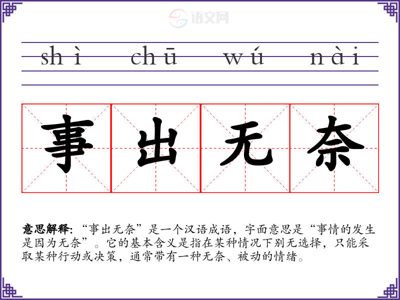 “事出无奈”是一个汉语成语,字面意思是“事情的发生是因为无奈”。它的基本含义是指在某种情况下别无选择,只能采取某种行动或决策,通常带有一种无奈、被动的情绪。