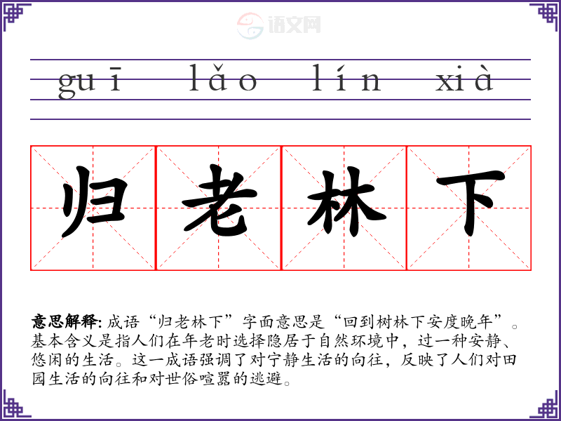 成语“归老林下”字面意思是“回到树林下安度晚年”。基本含义是指人们在年老时选择隐居于自然环境中,过一种安静、悠闲的生活。这一成语强调了对宁静生活的向往,反映了人们对田园生活的向往和对世俗喧嚣的逃避。