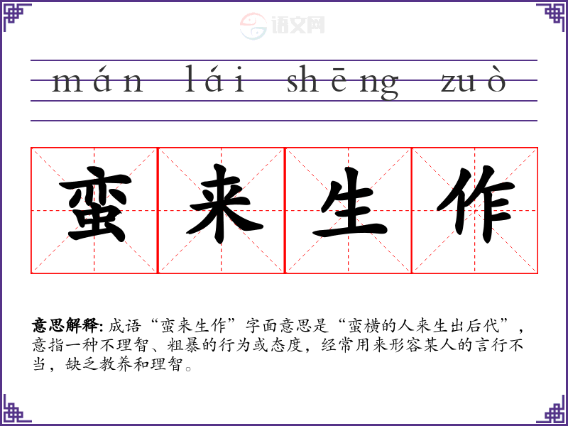 成语“蛮来生作”字面意思是“蛮横的人来生出后代”,意指一种不理智、粗暴的行为或态度,经常用来形容某人的言行不当,缺乏教养和理智。