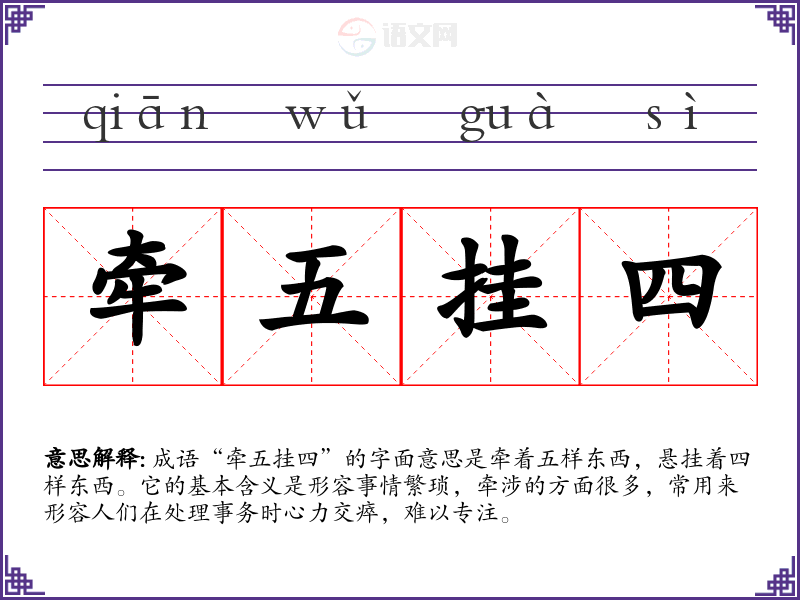 - 反义成语:游刃有余。该成语形容做事情很轻松自如,和“牵五挂四”形成鲜明对比。