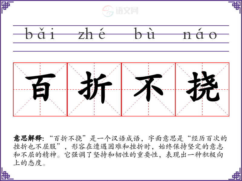 “百折不挠”是一个汉语成语,字面意思是“经历百次的挫折也不屈服”,形容在遭遇困难和挫折时,始终保持坚定的意志和不屈的精神。它强调了坚持和韧性的重要性,表现出一种积极向上的态度。