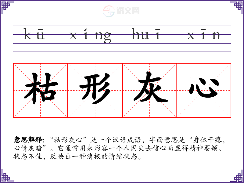 “枯形灰心”是一个汉语成语,字面意思是“身体干瘪,心情灰暗”。它通常用来形容一个人因失去信心而显得精神萎顿、状态不佳,反映出一种消极的情绪状态。