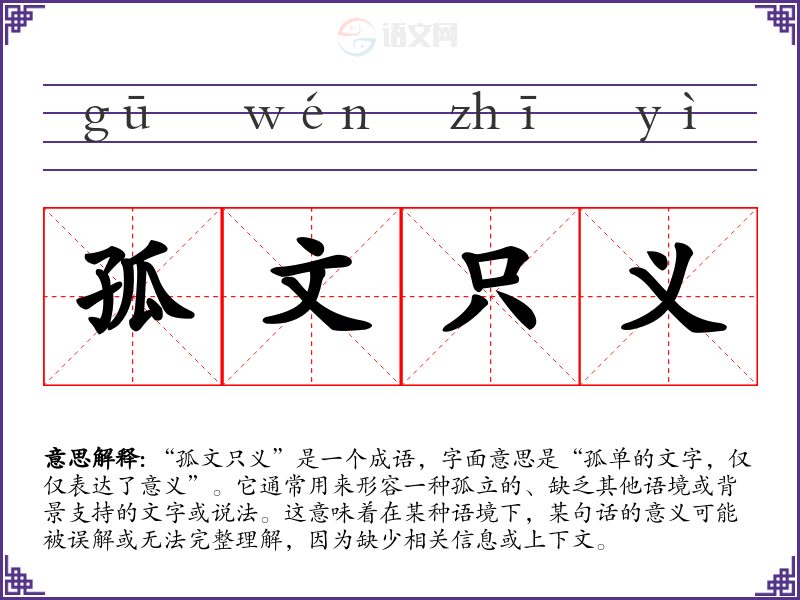 “孤文只义”并没有明确的历史背景和典故,它的构造是通过对汉字的组合而形成的。这个成语可以被视为一种对语言使用的批判,强调在交流中上下文的重要性。