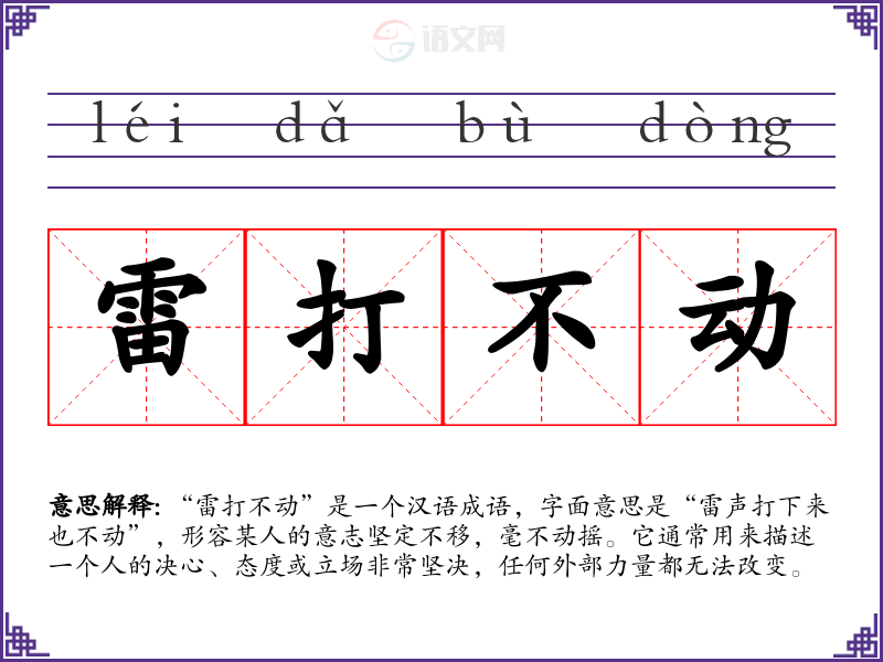 “雷打不动”是一个汉语成语,字面意思是“雷声打下来也不动”,形容某人的意志坚定不移,毫不动摇。它通常用来描述一个人的决心、态度或立场非常坚决,任何外部力量都无法改变。
