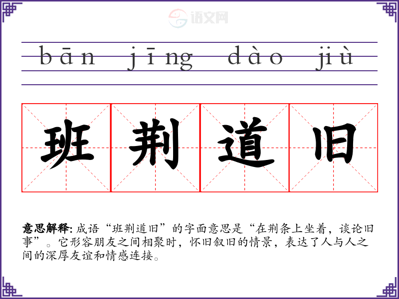 成语“班荆道旧”的字面意思是“在荆条上坐着,谈论旧事”。它形容朋友之间相聚时,怀旧叙旧的情景,表达了人与人之间的深厚友谊和情感连接。