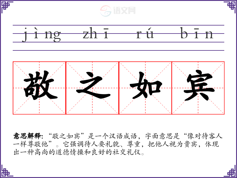 “敬之如宾”是一个汉语成语,字面意思是“像对待客人一样尊敬他”。它强调待人要礼貌、尊重,把他人视为贵宾,体现出一种高尚的道德情操和良好的社交礼仪。