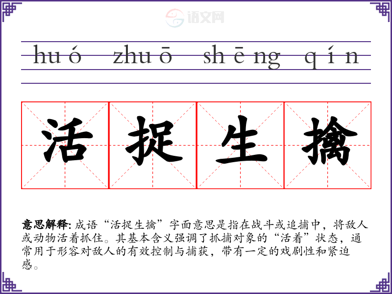 成语“活捉生擒”字面意思是指在战斗或追捕中,将敌人或动物活着抓住。其基本含义强调了抓捕对象的“活着”状态,通常用于形容对敌人的有效控制与捕获,带有一定的戏剧性和紧迫感。