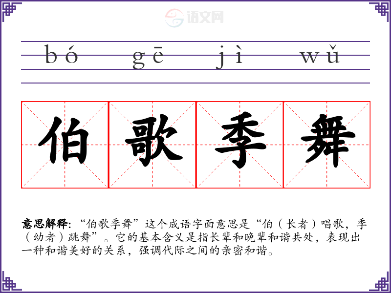 “伯歌季舞”这个成语字面意思是“伯(**)唱歌,季(幼者)跳舞”。它的基本含义是指长辈和晚辈和谐共处,表现出一种和谐美好的关系,强调代际之间的亲密和谐。
