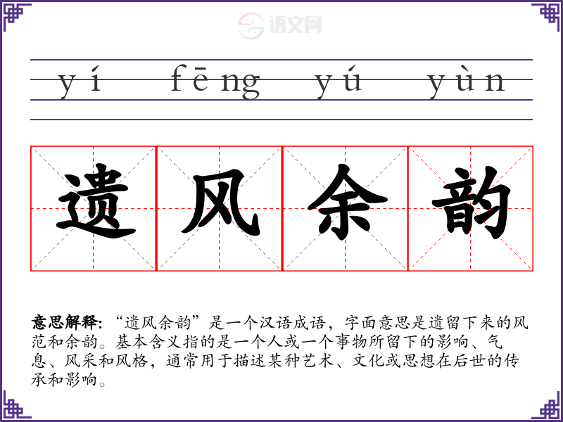 “遗风余韵”是一个汉语成语,字面意思是遗留下来的风范和余韵。基本含义指的是一个人或一个事物所留下的影响、气息、风采和风格,通常用于描述某种艺术、文化或思想在后世的传承和影响。