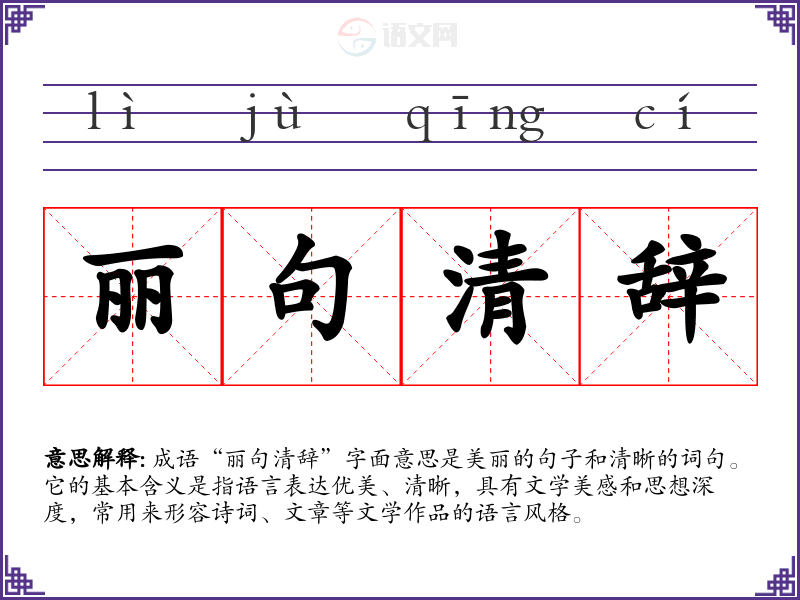 成语“丽句清辞”字面意思是美丽的句子和清晰的词句。它的基本含义是指语言表达优美、清晰,具有文学美感和思想深度,常用来形容诗词、文章等文学作品的语言风格。