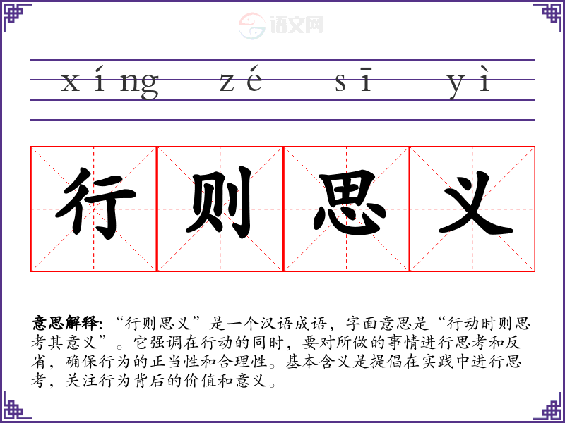 “行则思义”是一个汉语成语,字面意思是“行动时则思考其意义”。它强调在行动的同时,要对所做的事情进行思考和反省,确保行为的正当性和合理性。基本含义是提倡在实践中进行思考,关注行为背后的价值和意义。