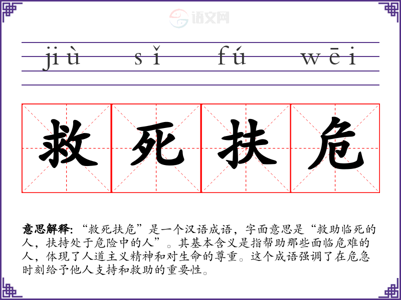 “救死扶危”是一个汉语成语,字面意思是“救助临死的人,扶持处于危险中的人”。其基本含义是指帮助那些面临危难的人,体现了人道主义精神和对生命的尊重。这个成语强调了在危急时刻给予他人支持和救助的重要性。