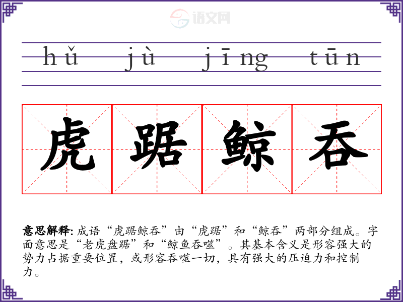 成语“虎踞鲸吞”由“虎踞”和“鲸吞”两部分组成。字面意思是“**盘踞”和“鲸鱼吞噬”。其基本含义是形容强大的势力占据重要位置,或形容吞噬一切,具有强大的压迫力和控制力。