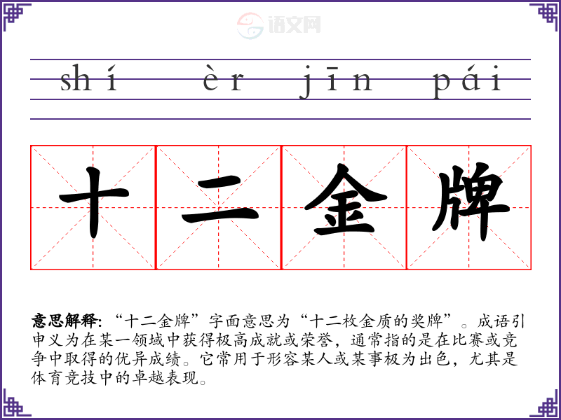 “十二金牌”字面意思为“十二枚金质的奖牌”。成语引申义为在某一领域中获得极高成就或荣誉,通常指的是在比赛或竞争中取得的优异成绩。它常用于形容某人或某事极为出色,尤其是体育竞技中的卓越表现。