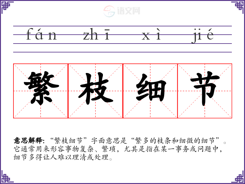 “繁枝细节”字面意思是“繁多的枝条和细微的细节”。它通常用来形容事物复杂、繁琐,尤其是指在某一事务或问题中,细节多得让人难以理清或处理。
