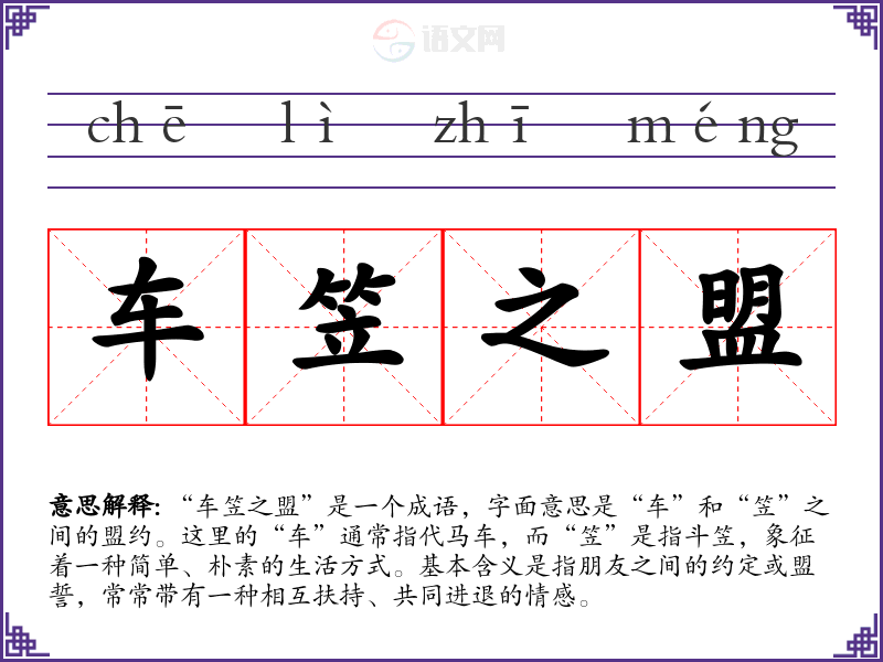 “车笠之盟”是一个成语,字面意思是“车”和“笠”之间的盟约。这里的“车”通常指代马车,而“笠”是指斗笠,象征着一种简单、朴素的生活方式。基本含义是指朋友之间的约定或盟誓,常常带有一种相互扶持、共同进退的情感。
