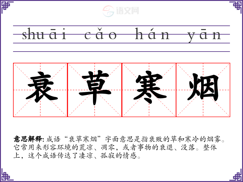 成语“衰草寒烟”字面意思是指衰败的草和寒冷的烟雾。它常用来形容环境的荒凉、凋零,或者事物的衰退、没落。整体上,这个成语传达了凄凉、孤寂的情感。