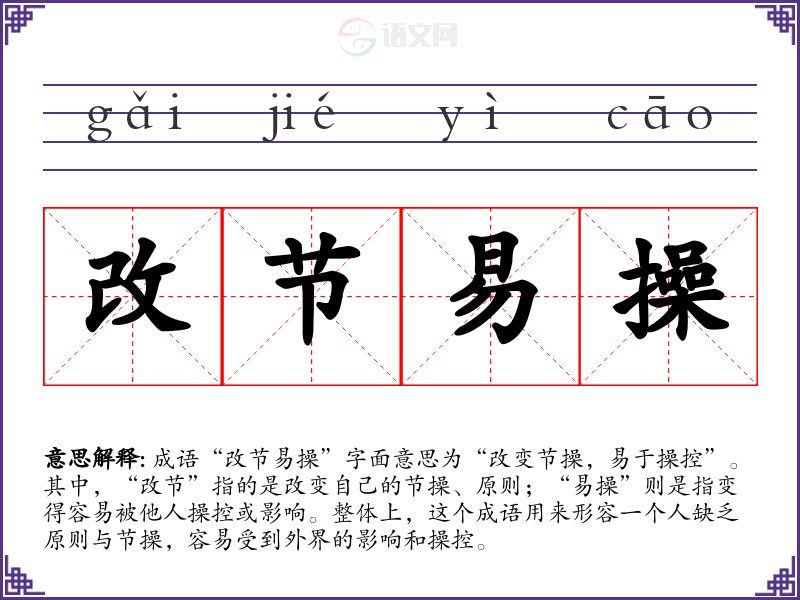 成语“改节易操”字面意思为“改变节操,易于操控”。其中,“改节”指的是改变自己的节操、原则;“易操”则是指变得容易被他人操控或影响。整体上,这个成语用来形容一个人缺乏原则与节操,容易受到外界的影响和操控。