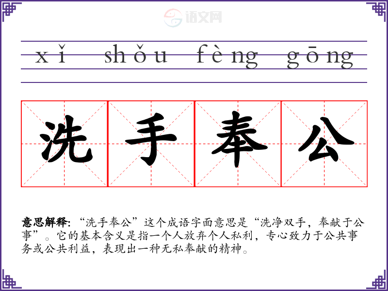 “洗手奉公”这个成语字面意思是“洗净双手,奉献于公事”。它的基本含义是指一个人放弃****,专心致力于公共事务或公共利益,表现出一种无私奉献的精神。