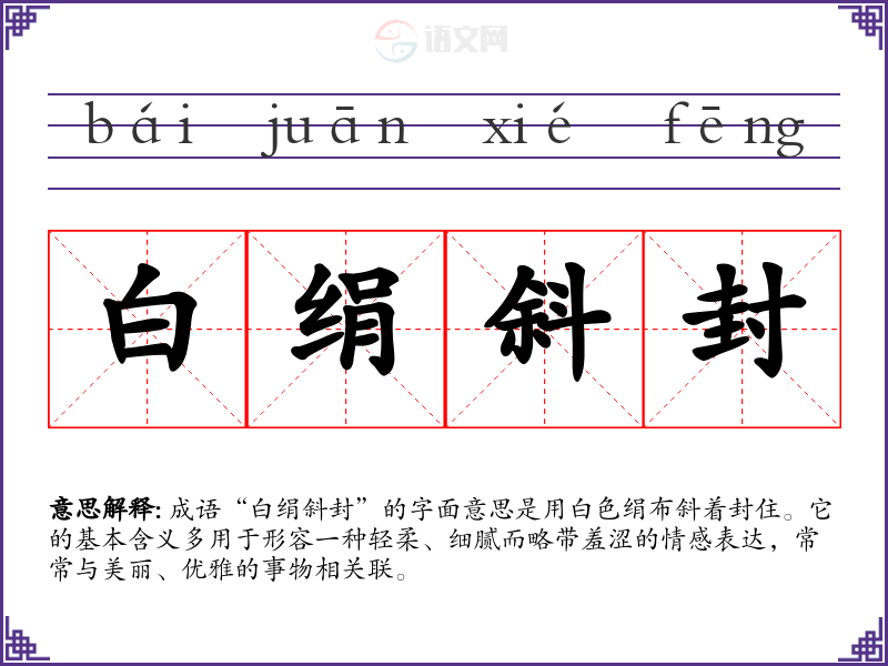 成语“白绢斜封”的字面意思是用白色绢布斜着封住。它的基本含义多用于形容一种轻柔、细腻而略带羞涩的情感表达,常常与美丽、优雅的事物相关联。