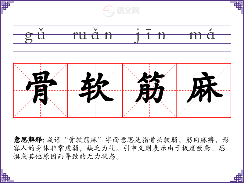 成语“骨软筋麻”字面意思是指骨头软弱,筋肉麻痹,形容人的身体非常虚弱,缺乏力气。引申义则表示由于极度疲惫、恐惧或其他原因而导致的无力状态。