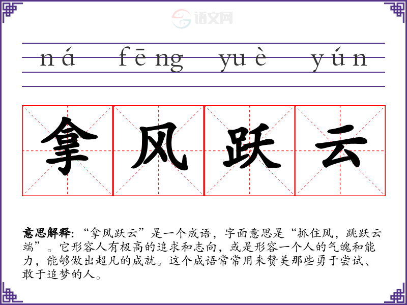 “拿风跃云”是一个成语,字面意思是“抓住风,跳跃云端”。它形容人有极高的追求和志向,或是形容一个人的气魄和能力,能够做出超凡的成就。这个成语常常用来赞美那些勇于尝试、敢于追梦的人。