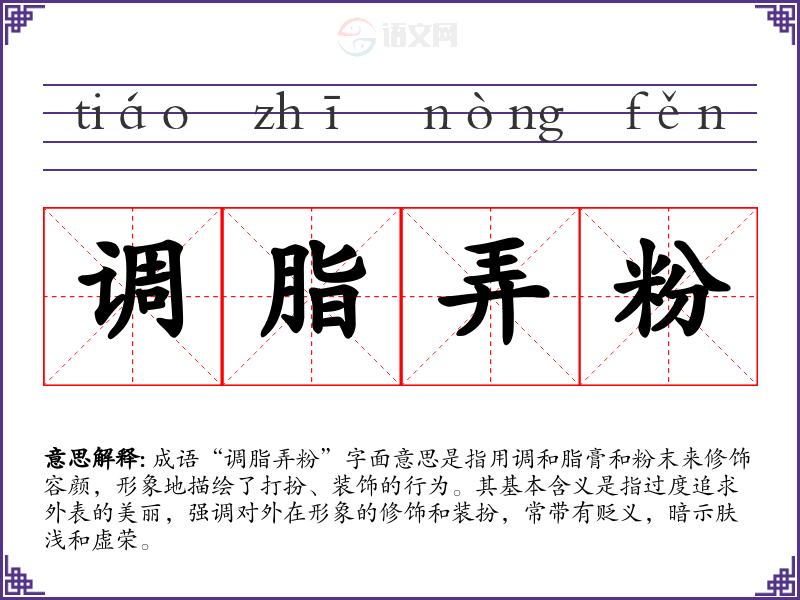 成语“调脂弄粉”字面意思是指用调和脂膏和粉末来修饰容颜,形象地描绘了打扮、装饰的行为。其基本含义是指过度追求外表的美丽,强调对外在形象的修饰和装扮,常带有贬义,暗示肤浅和虚荣。