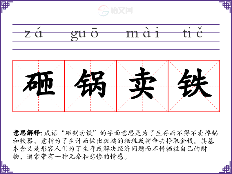 成语“砸锅卖铁”的字面意思是为了生存而不得不卖掉锅和铁器,意指为了生计而做出极端的牺牲或拼命去挣取金钱。其基本含义是形容人们为了生存或解决经济问题而不惜牺牲自己的财物,通常带有一种无奈和悲惨的情感。
