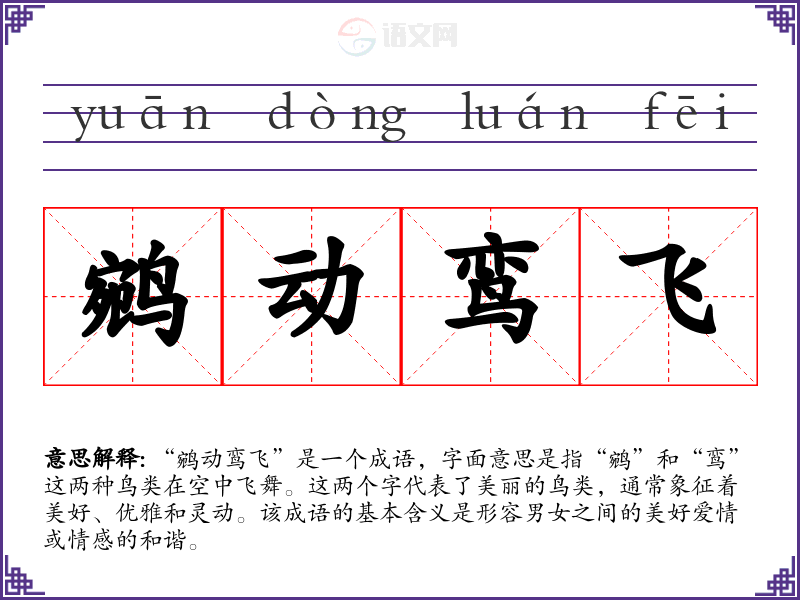 “鹓动鸾飞”是一个成语,字面意思是指“鹓”和“鸾”这两种鸟类在空中飞舞。这两个字代表了美丽的鸟类,通常象征着美好、优雅和灵动。该成语的基本含义是形容男女之间的美好爱情或情感的和谐。