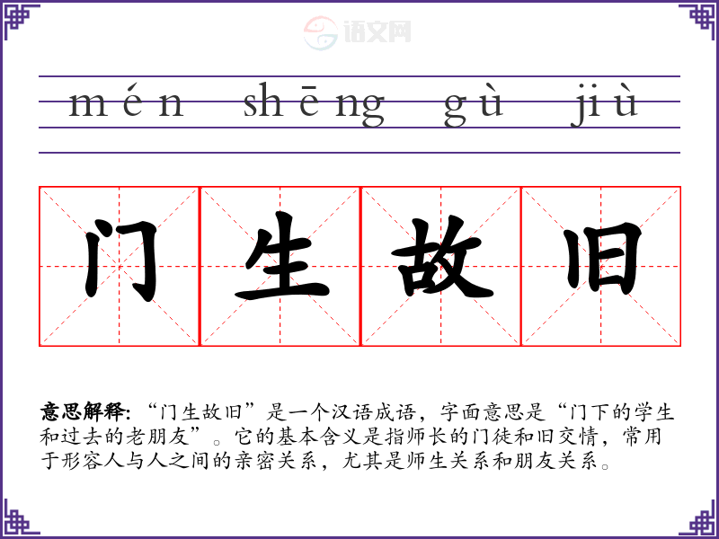 “门生故旧”是一个汉语成语,字面意思是“门下的学生和过去的老朋友”。它的基本含义是指师长的门徒和旧交情,常用于形容人与人之间的亲密关系,尤其是师生关系和朋友关系。