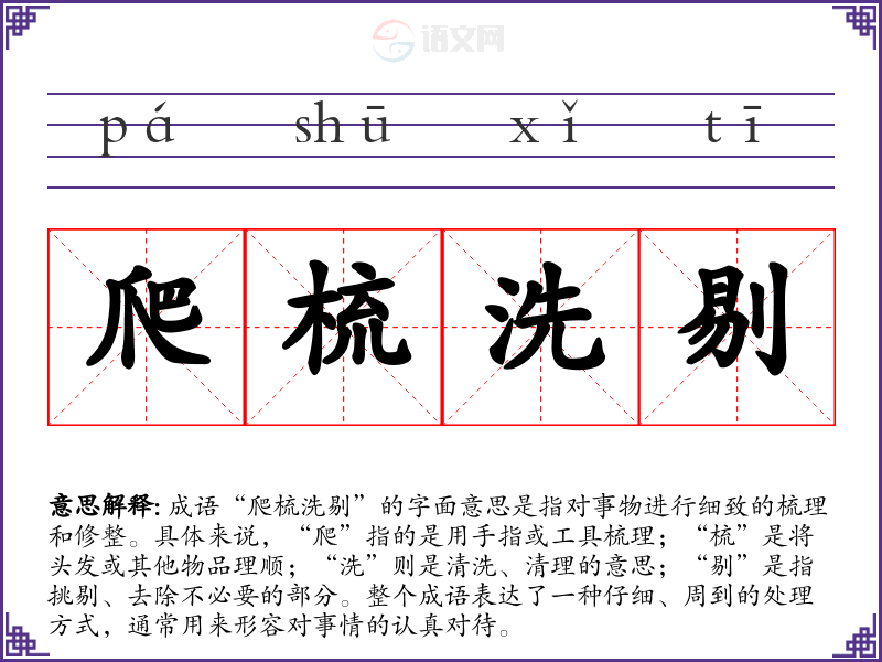 成语“爬梳洗剔”的字面意思是指对事物进行细致的梳理和修整。具体来说,“爬”指的是用手指或工具梳理;“梳”是将头发或其他物品理顺;“洗”则是清洗、清理的意思;“剔”是指挑剔、去除不必要的部分。整个成语表达了一种仔细、周到的处理方式,通常用来形容对事情的认真对待。