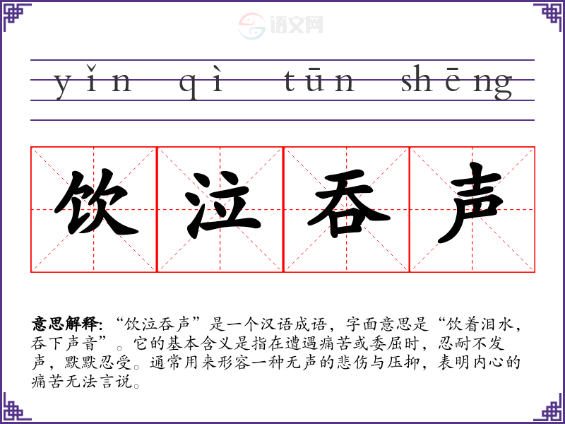 “饮泣吞声”是一个汉语成语,字面意思是“饮着泪水,吞下声音”。它的基本含义是指在遭遇痛苦或委屈时,忍耐不发声,默默忍受。通常用来形容一种无声的悲伤与压抑,表明内心的痛苦无法言说。