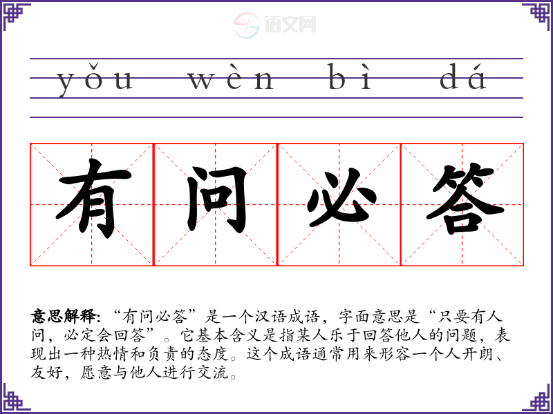“有问必答”是一个汉语成语,字面意思是“只要有人问,必定会回答”。它基本含义是指某人乐于回答他人的问题,表现出一种热情和负责的态度。这个成语通常用来形容一个人开朗、友好,愿意与他人进行交流。