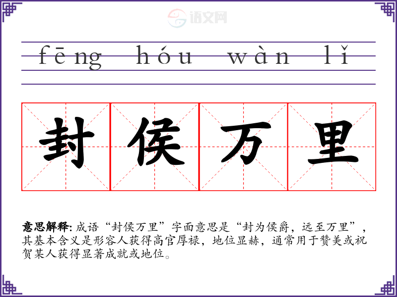 成语“封侯万里”字面意思是“封为侯爵,远至万里”,其基本含义是形容人获得高官厚禄,地位显赫,通常用于赞美或祝贺某人获得显著成就或地位。