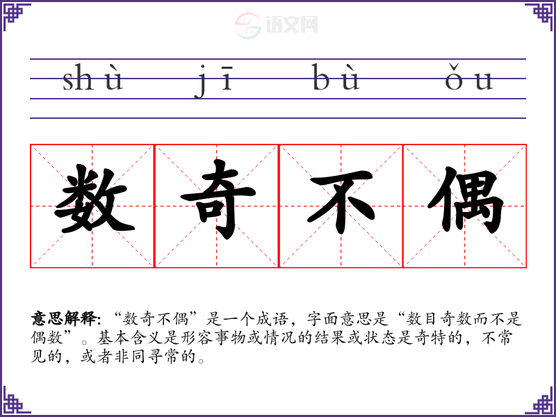 “数奇不偶”是一个成语,字面意思是“数目奇数而不是偶数”。基本含义是形容事物或情况的结果或状态是奇特的,不常见的,或者非同寻常的。