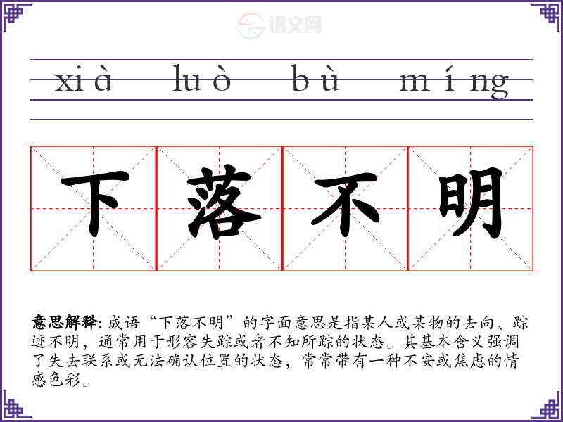 成语“下落不明”的字面意思是指某人或某物的去向、踪迹不明,通常用于形容失踪或者不知所踪的状态。其基本含义强调了失去联系或无法确认位置的状态,常常带有一种不安或焦虑的情感色彩。