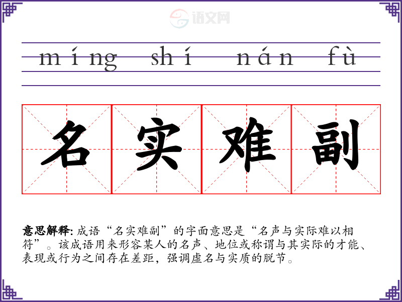 成语“名实难副”的字面意思是“名声与实际难以相符”。该成语用来形容某人的名声、地位或称谓与其实际的才能、表现或行为之间存在差距,强调虚名与实质的脱节。