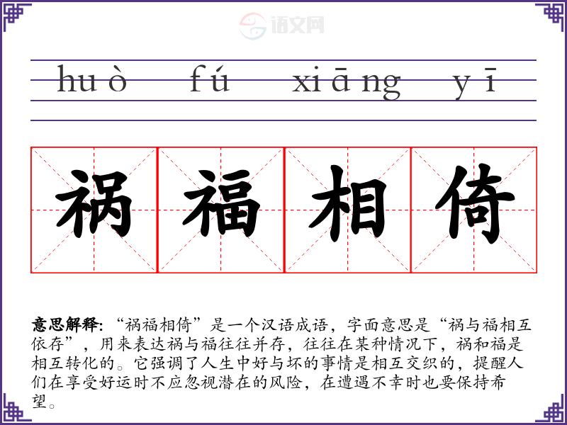 “祸福相倚”是一个汉语成语,字面意思是“祸与福相互依存”,用来表达祸与福往往并存,往往在某种情况下,祸和福是相互转化的。它强调了人生中好与坏的事情是相互交织的,提醒人们在享受好运时不应忽视潜在的风险,在遭遇不幸时也要保持希望。